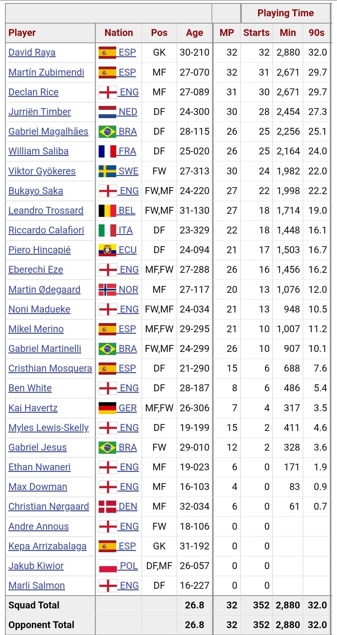 The Rice and Zubi minutes are absolutely damning. Not rotating them/finding sustainable alternatives to the double pivot is probably one of the main factors for the impending/in-progress collapse this season. Arteta “always playing his favorites” is and never was sustainable.
