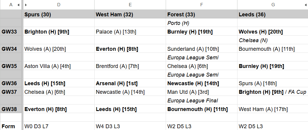 Not gunna lie if we weren’t so bad, we would have had chance. West Ham’s fixture is rough. Forest is likely to go to the Europa Final.