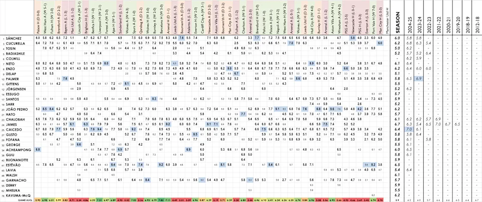 SUBPAR (4.5-5.4): João Pedro (5.1), Fofana (5.0), Gusto (4.9), Sánchez (4.9), Palmer (4.9), Neto (4.8), Acheampong (4.7, sub), Lavia (4.7, sub), Santos (4.5), Essugo (4.5, sub)