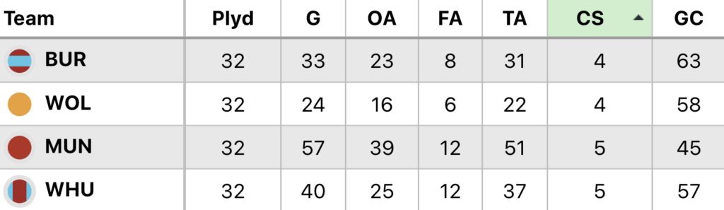 Above: Teams sorted by fewest clean sheets (CS) in 2025/26
