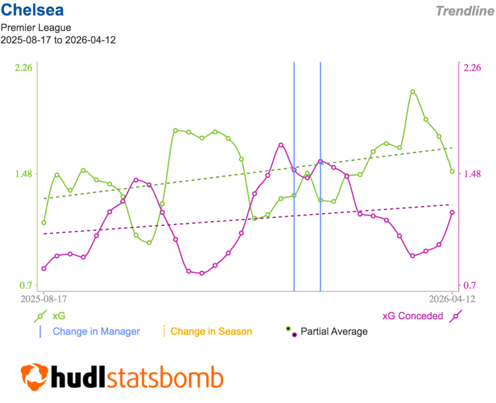 Above: Chelsea’s rolling six-match xG/xGC chart in 2025/26
