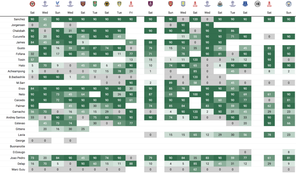 Using our new Minutes Tracker, which you can find in the Members Area, we can view the game time of every Chelsea player under Rosenior, both in domestic competitions and in Europe.