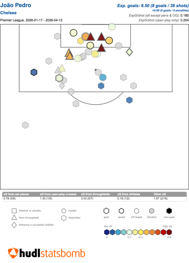 Here’s his shot map in that time, which shows that he’s getting into some really good positions in/around the six-yard box: