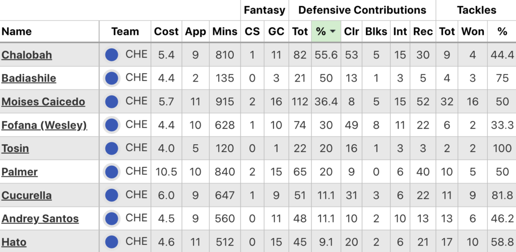 Above: Chelsea players sorted by DefCon success rate (%) since the appointment of Liam Rosenior