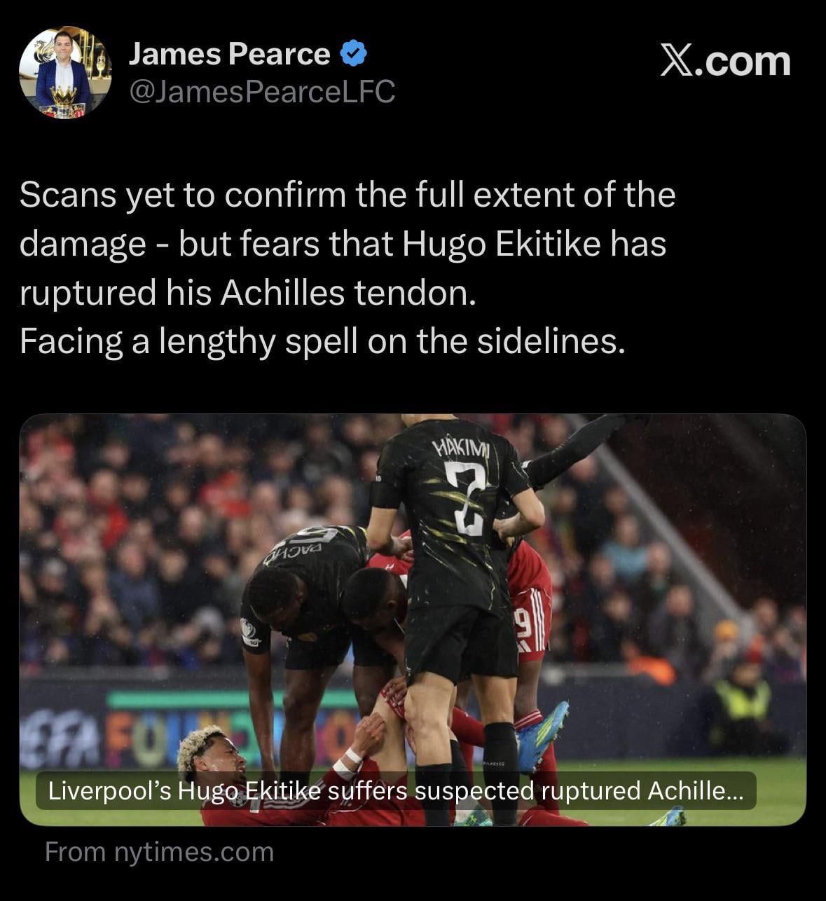 [Pearce] Scans yet to confirm the full extent of the damage – but fears that Hugo Ekitike has ruptured his Achilles tendon. Facing a lengthy spell on the sidelines.