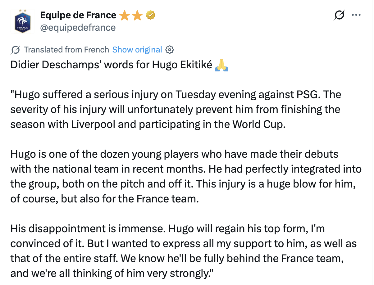 Honestly, his injury has been on my mind nonstop since yesterday. Such an exciting prospect for Liverpool and France. I hope his recovery goes well.