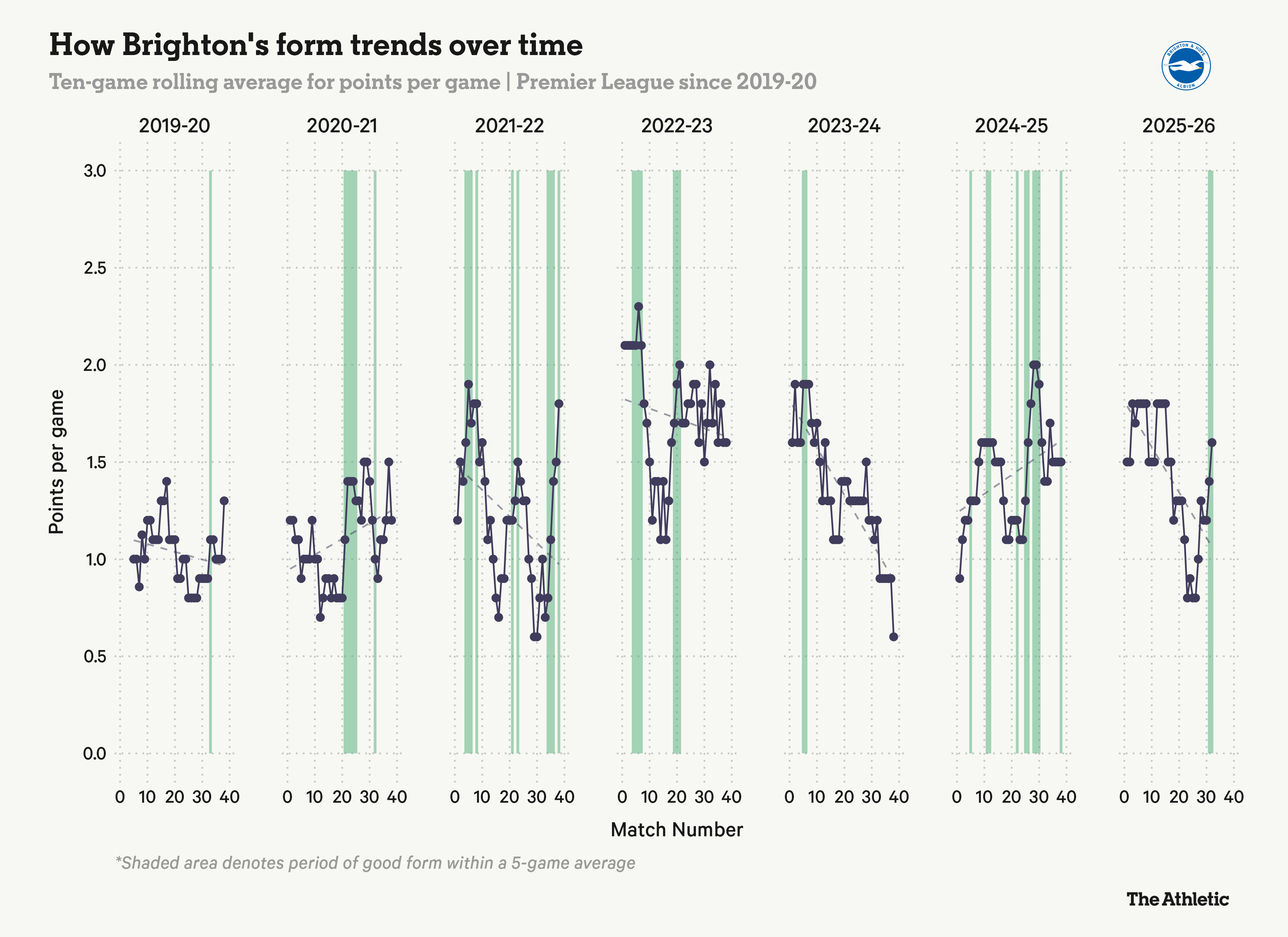 The German head coach has made Brighton more consistent. While they hit fewer teams for big scores than in the De Zerbi era, they rarely capitulate anymore.