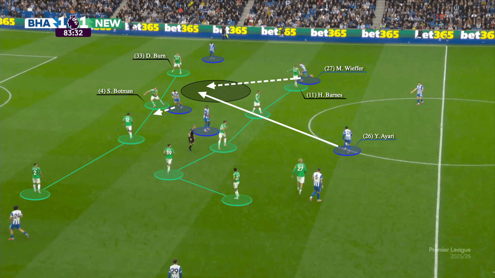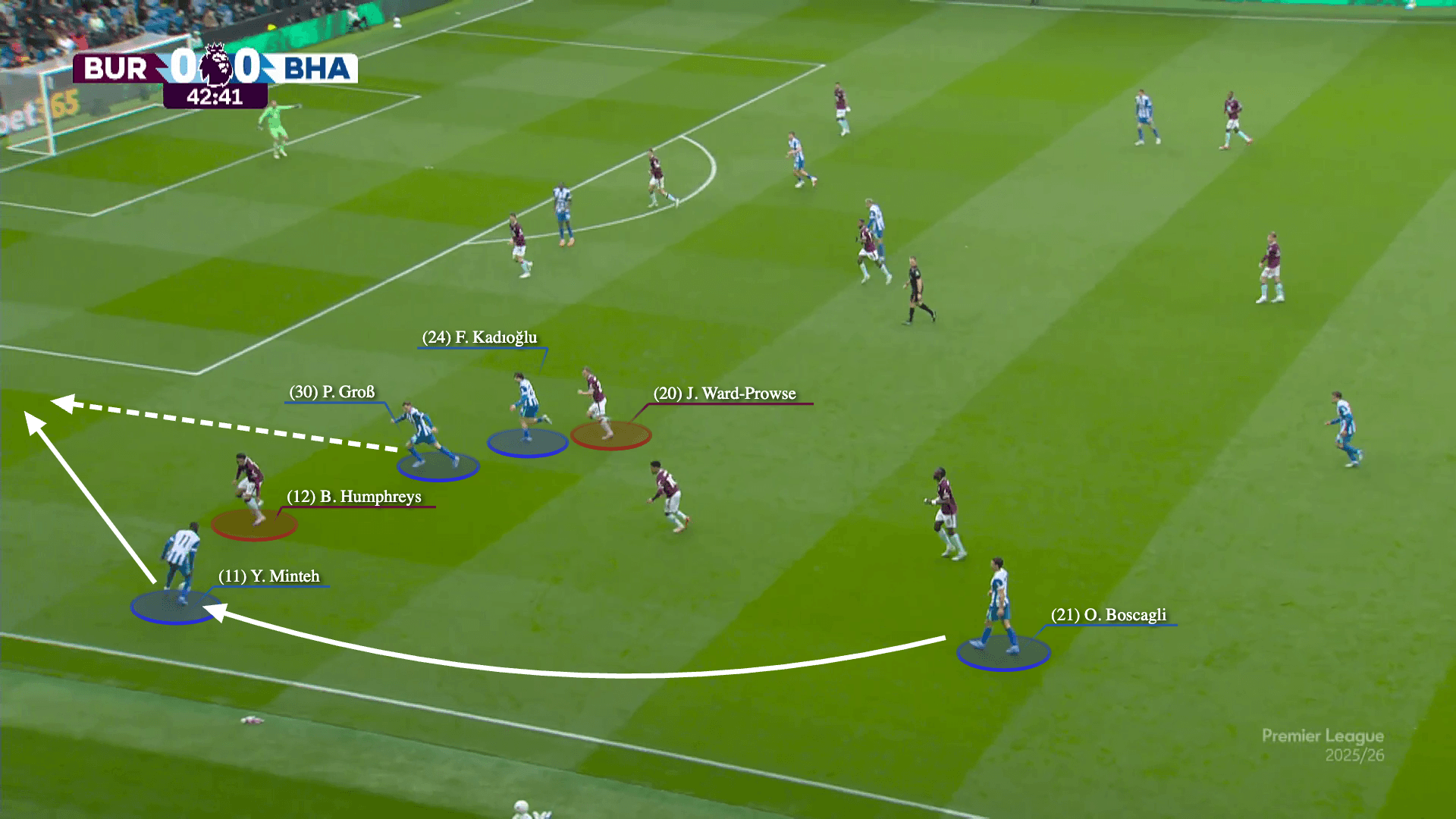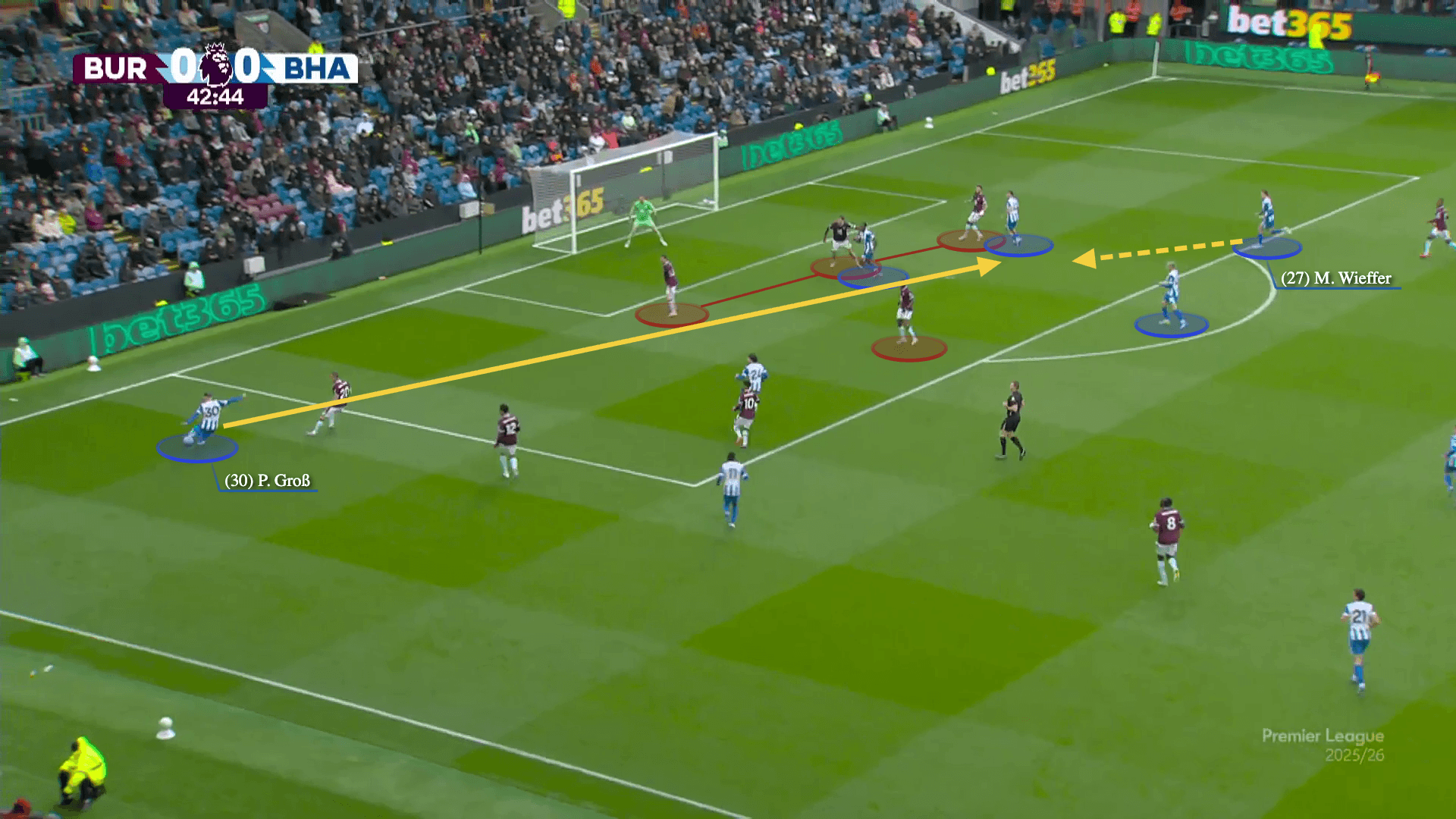 The midfielder consistently makes angled runs between opposition centre-backs and full-backs, which is how Brighton created the opener for Wieffer at the back post away to Burnley.