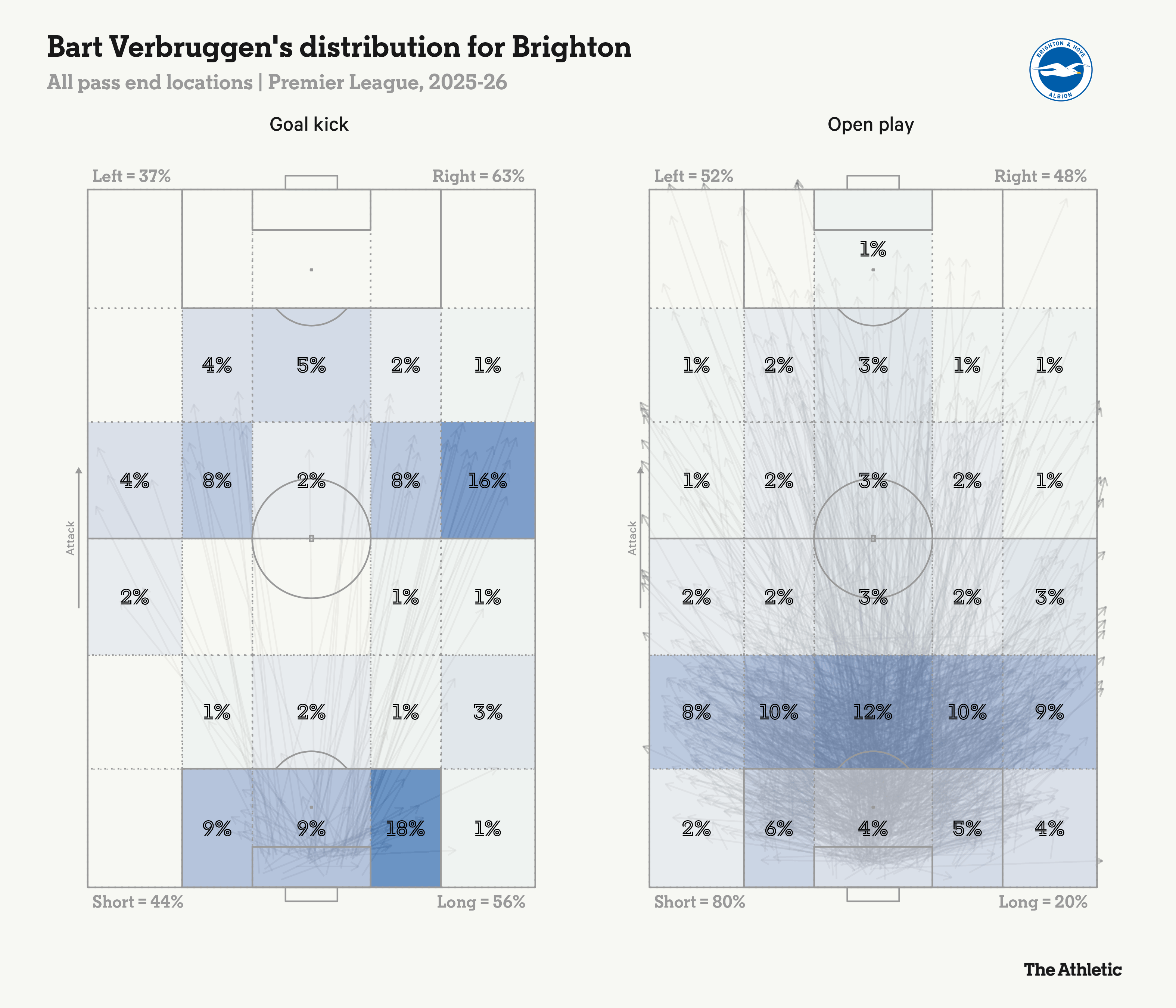 Some of the press baiting from the De Zerbi era remains, especially against lower-table opposition when Brighton want to avoid facing a low block. This is why Bart Verbruggen has more touches than any other Premier League goalkeeper. Much of his passing is kept short, as illustrated below