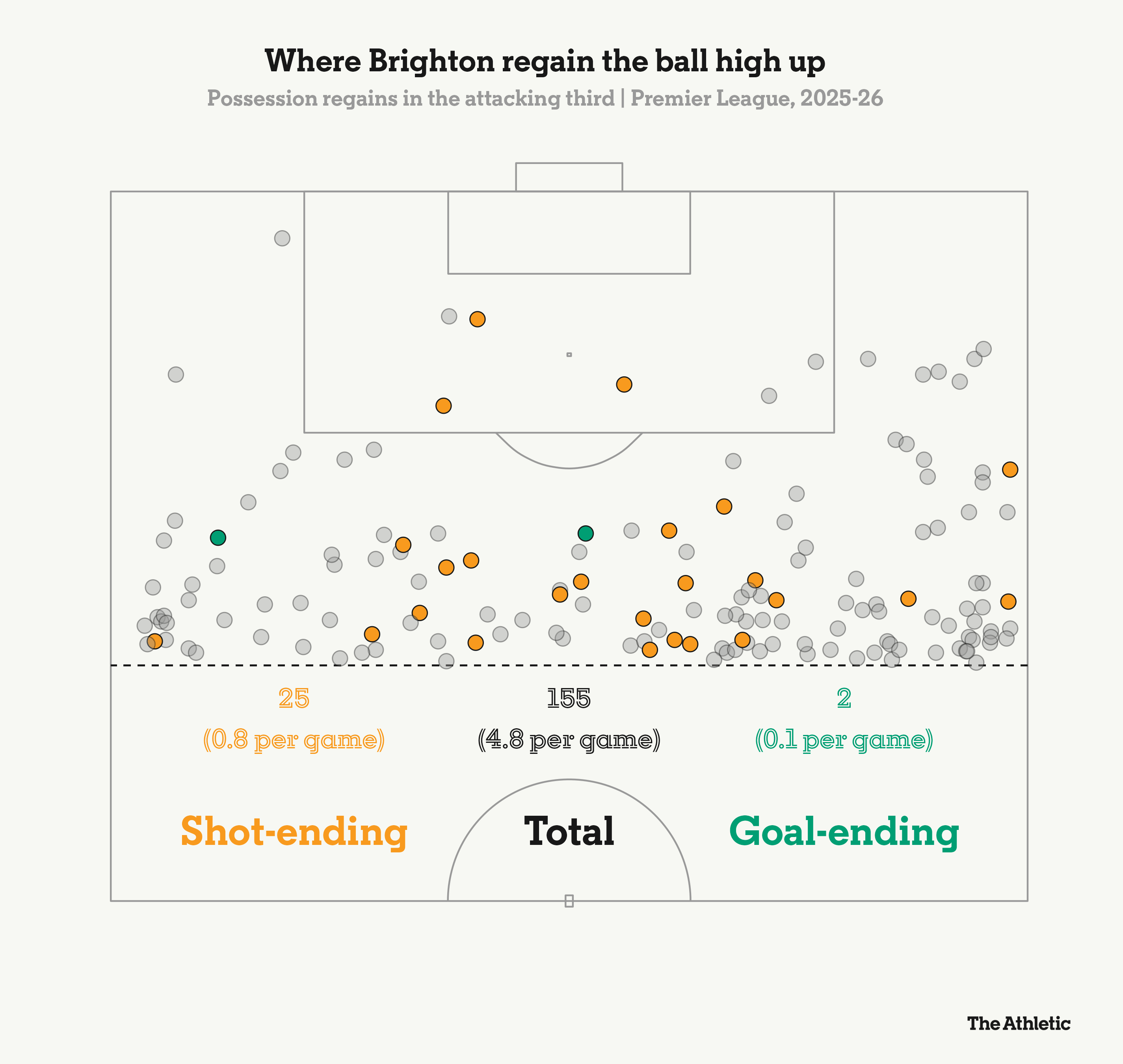 The out-of-possession base is strong. Hurzeler has cited compatriot Jurgen Klopp and his Liverpool team as inspiration. In the Premier League this term, Brighton are tied with Arsenal for the most final-third regains (155).
