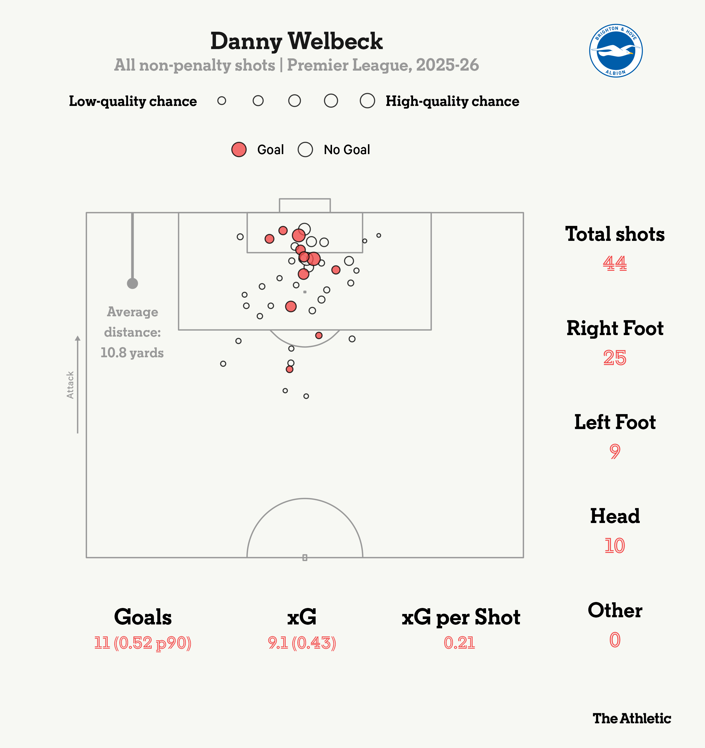 Leaning into crosses as a chief method of chance creation has suited Welbeck, who is a strong one-touch finisher and has shown excellent striker instincts this term. His penalty-box poaching is illustrated in his shot map above. Hurzeler demands less of the deeper, back-to-goal involvement than De Zerbi’s style required, simplifying the game for Welbeck.