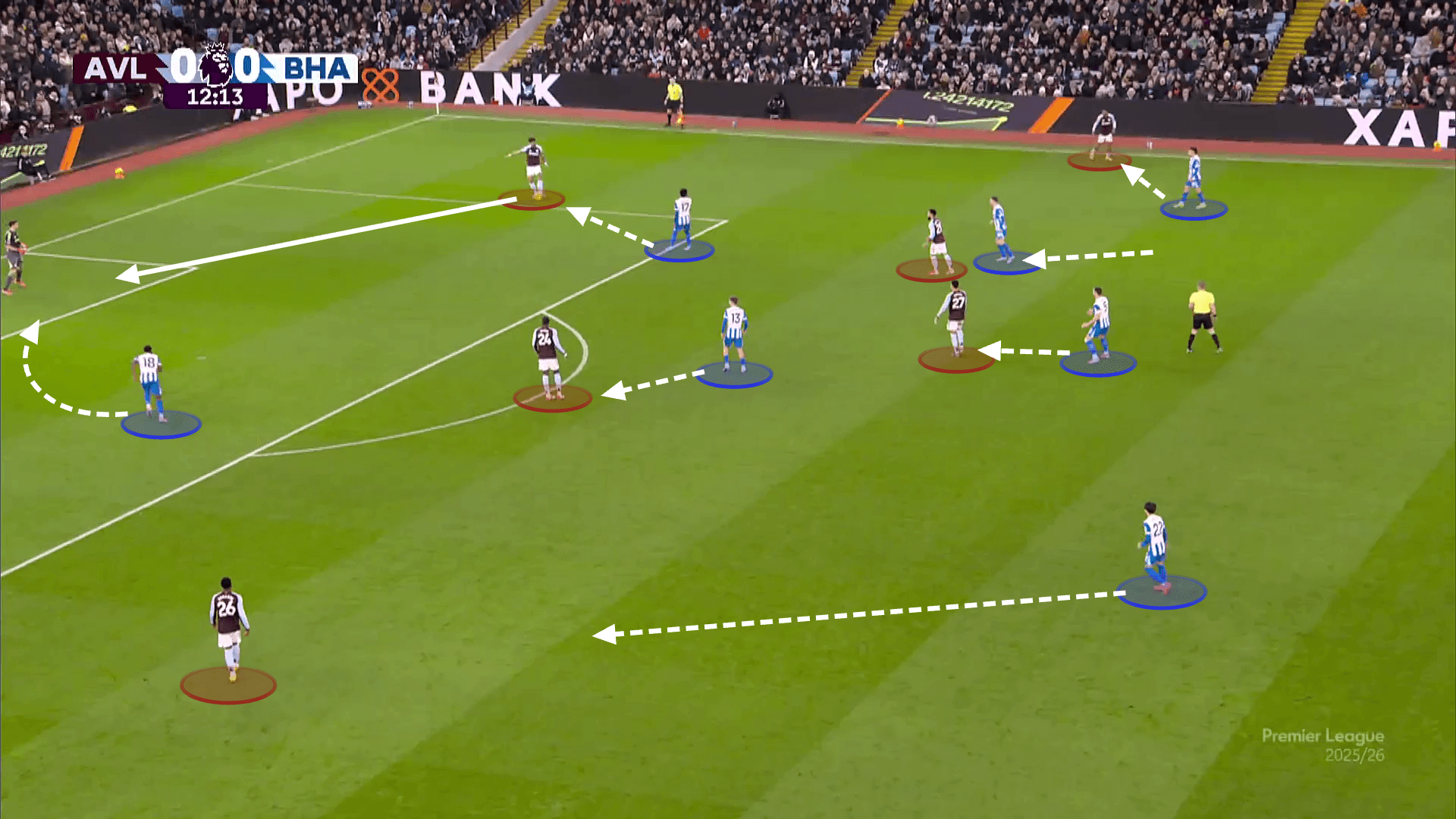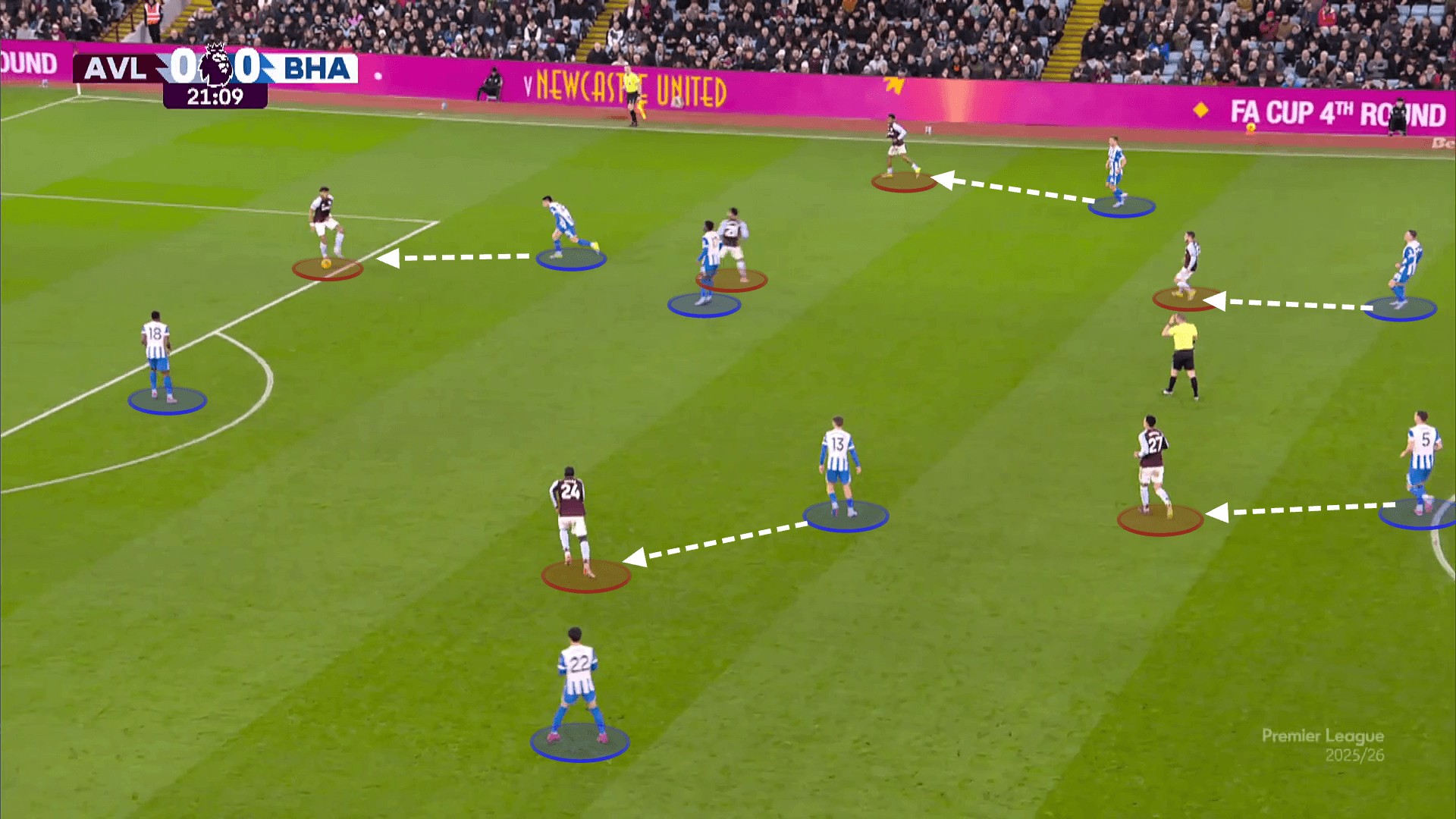 Centre-backs are required to follow opposition attacking midfielders upfield — see Lewis Dunk (No 5) tracking Morgan Rogers (Aston Villa’s No 27) in the grabs below — locking on to shut down passing options and force opponents long.