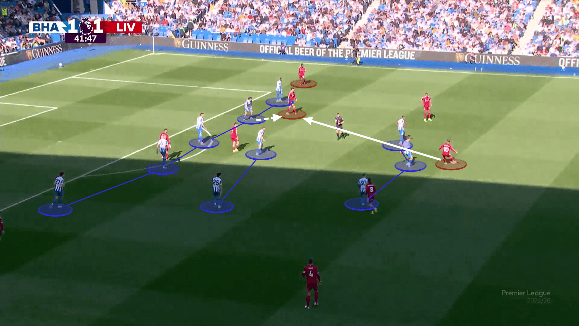 That showed at home to Liverpool with another Hurzeler tweak, as he switched left-footed Minteh from an inverted (right) winger to a traditional (left) one. His whipped cross found Hinshelwood, who squared it for Danny Welbeck to tap in.