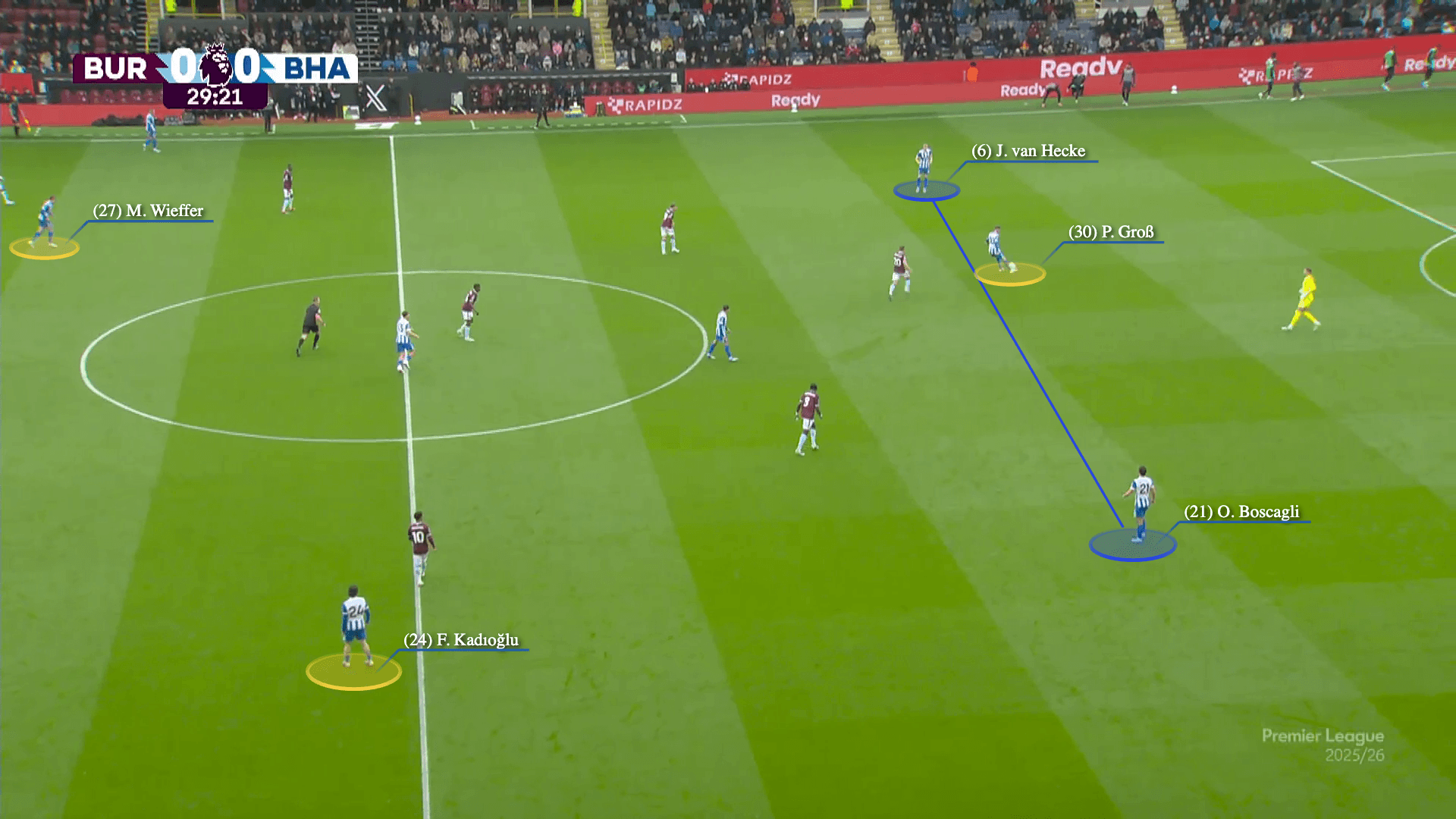 Here is a moment from the first half of the Burnley win that typifies how Brighton build up. The centre-backs split wide to allow a midfielder to drop in — on this occasion, Pascal Gross. Kadioglu and Wieffer have taken up high, narrow positions.