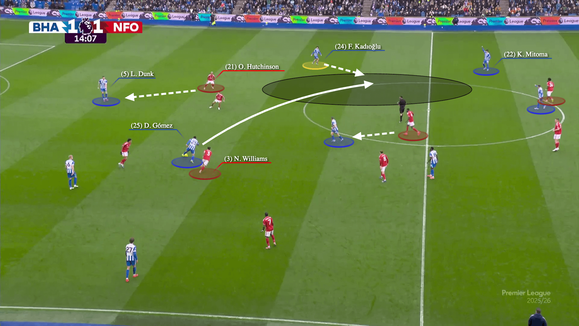 It tends to be Minteh or Mitoma, with Diego Gomez effectively a wide ‘No 10’ — a playmaker drifting inside. He provides a box threat — he has scored 10 goals across all competitions this season — and offers the running power that Hurzeler loves for aggressive pressing.