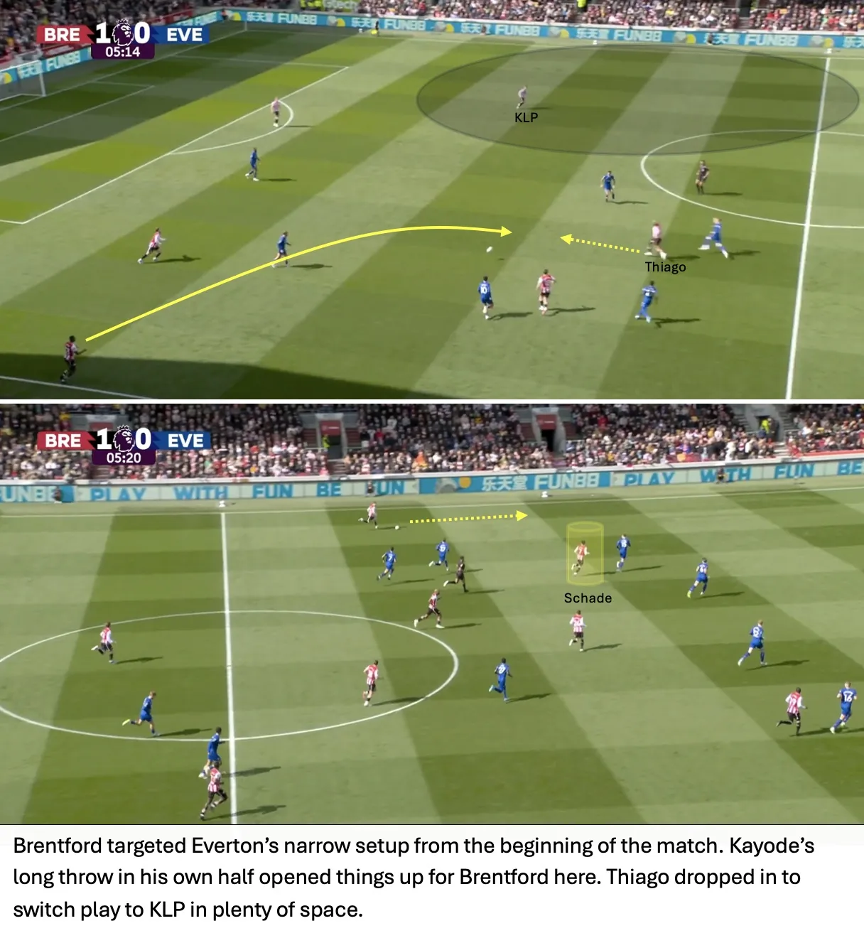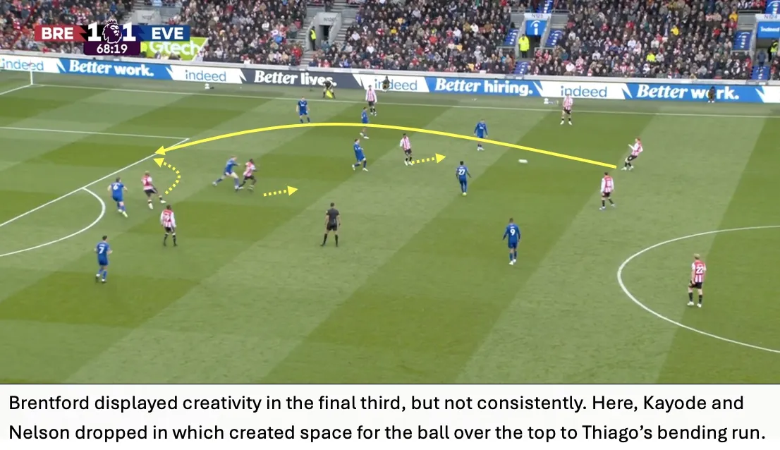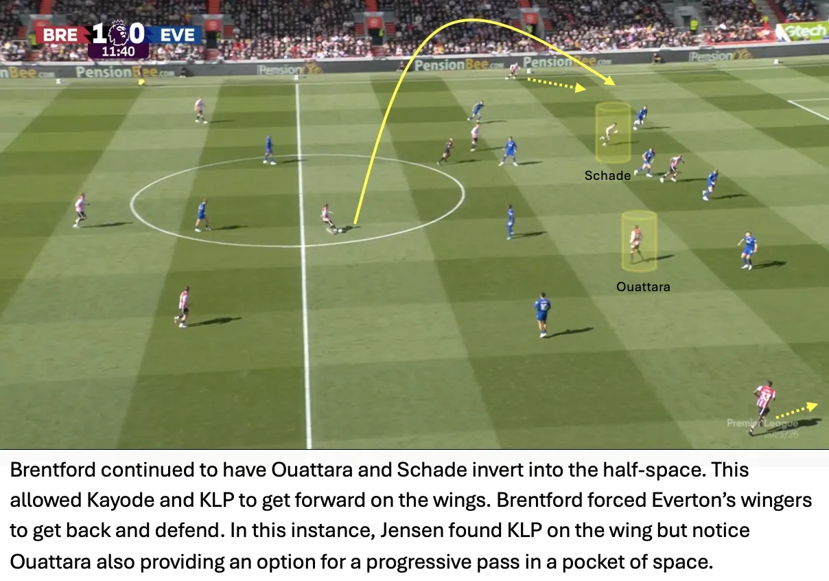 Keith Andrews sent out a strong starting XI, but lacked options off the bench. The Bees came out in a 4-2-3-1 with Kayode, van den Berg, Collins, and Lewis-Potter at the back. Yarmoliuk and Jensen formed a double pivot with Damsgaard at the 10. Ouattara and Schade the wingers supporting Thiago leading the line.