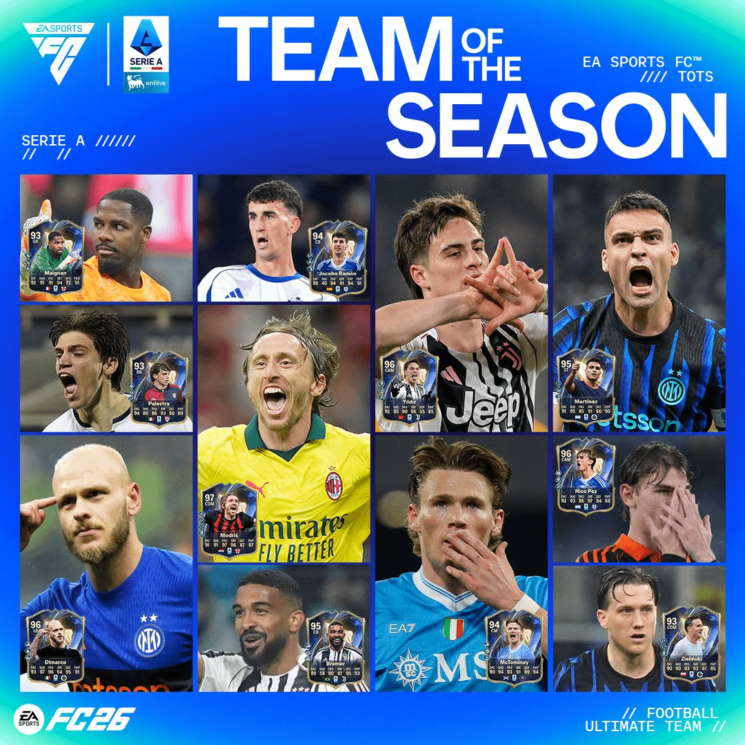 Serie A Team of the Season: Maignan, Dimarco, Ramon, Bremer, Palestra, Modric, Yildiz, McTominay, Zielinski, Paz, Martinez. Other additional players: Ndicka, Rabiot, Perrone, Akanji, Hojlund, Vlasic, Svilar, Douvakis, McKennie, Wesley, Davis, Locatelli, Pavlovic, Saelemaekers, Esposito