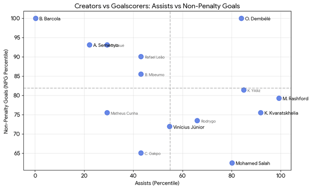 - Insights: Rashford sits a bit shy into the bottom right elite top-right quadrant alongside Ousmane Dembélé and K. Kvaratskhelia. Interestingly, you can see how Bradley Barcola sits firmly in the extreme top-left as a pure finisher compared to Rashford's more balanced creative threat. while i have not included raphinha since he was injured most of the season ( for those wondering olise would be extreme corner right and yamal just outside the box in extreme right corner bit beyond olise but close)