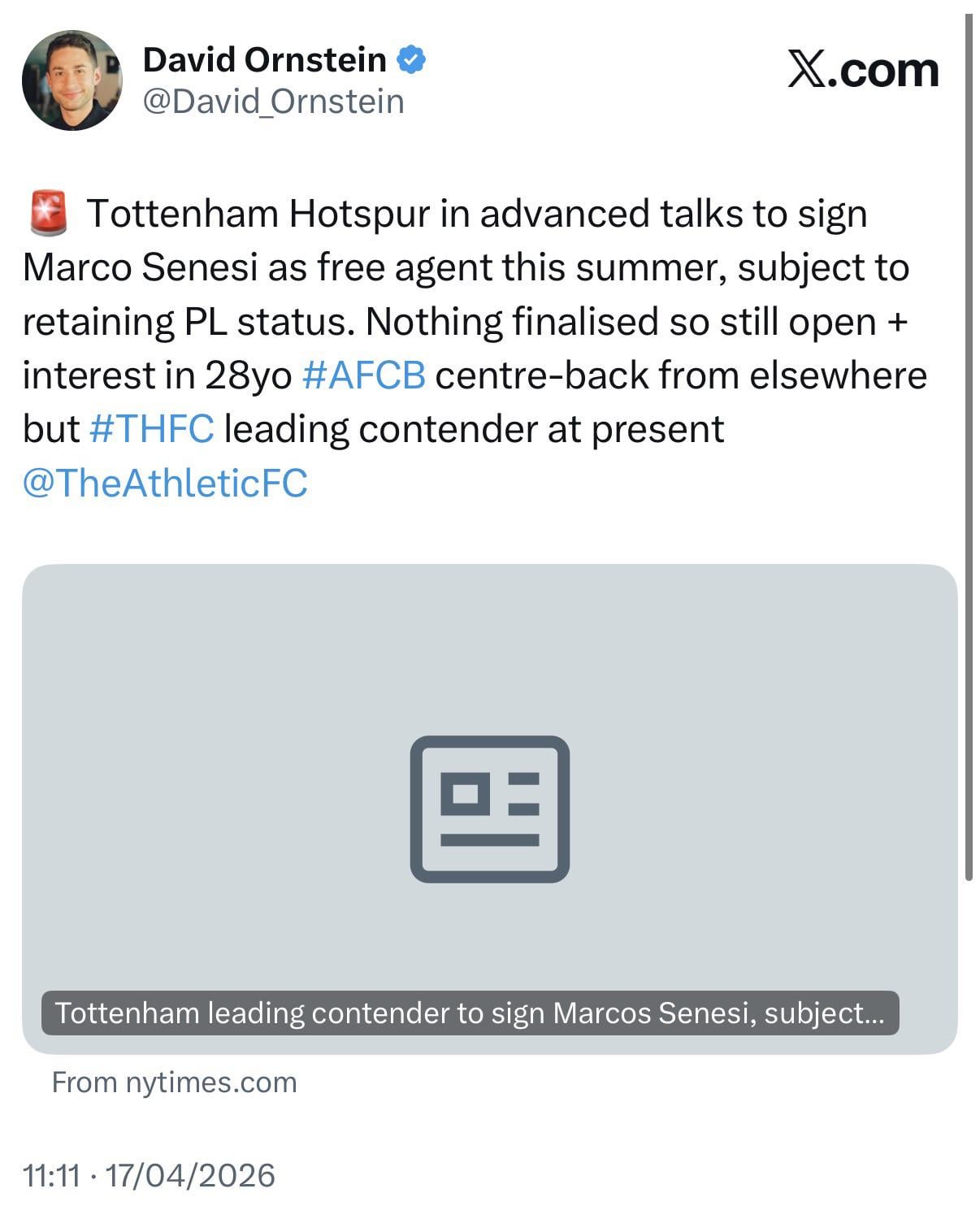 π¨ Tottenham Hotspur in advanced talks to sign Marco Senesi as free agent this summer, subject to retaining PL status. Nothing finalised so still open + interest in 28yo #AFCB centre-back from elsewhere but #THFC leading contender at present (David Ornstein π₯)