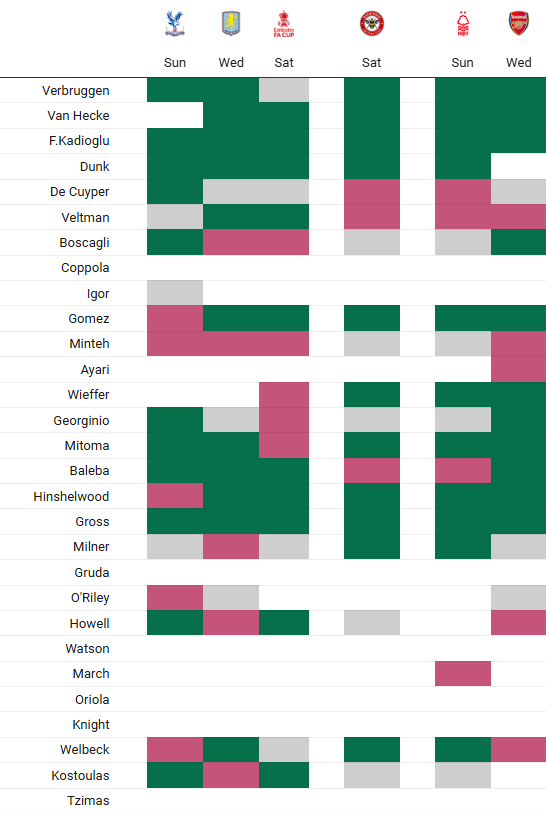 Dunk and Milner are going to miss the first half of Double Gameweek 33 anyway but Welbeck is obviously a concern for the second of the Double Gameweek 33 matches.