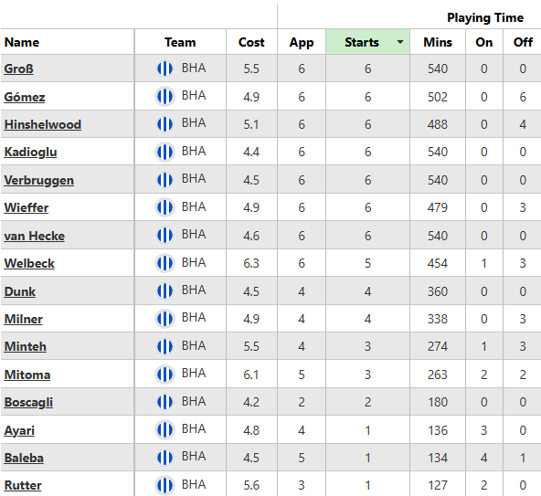 During those six Gameweeks, seven players are ever-present starters (Dunk, Milner and Welbeck being three of the exceptions):