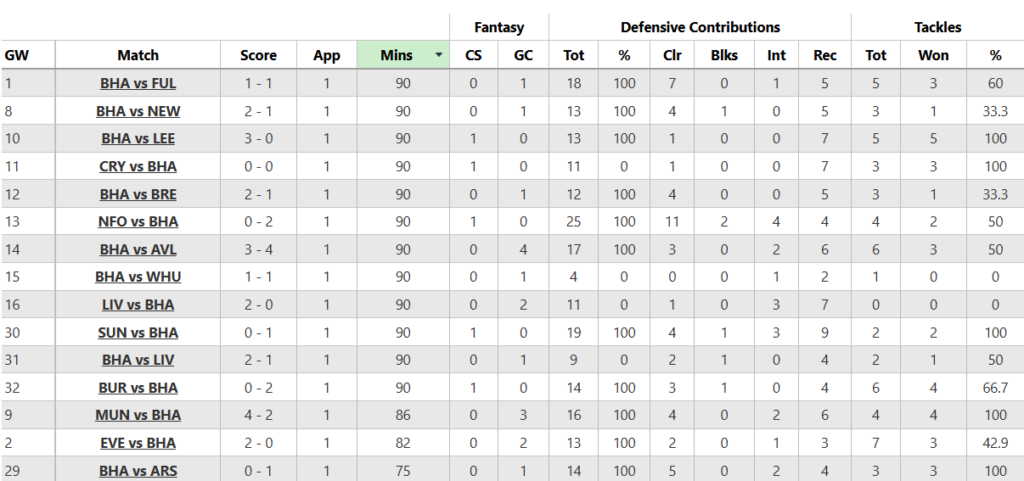 Gross has started every league match since his ‘second’ Albion full debut in Gameweek 21. He’s Brighton’s leading chance creator since then. Wieffer (Hurzeler’s clear first-choice right-back), meanwhile, is a DefCon machine, hitting the threshold in 11 of the 15 games in which he’s lasted 75+ minutes: