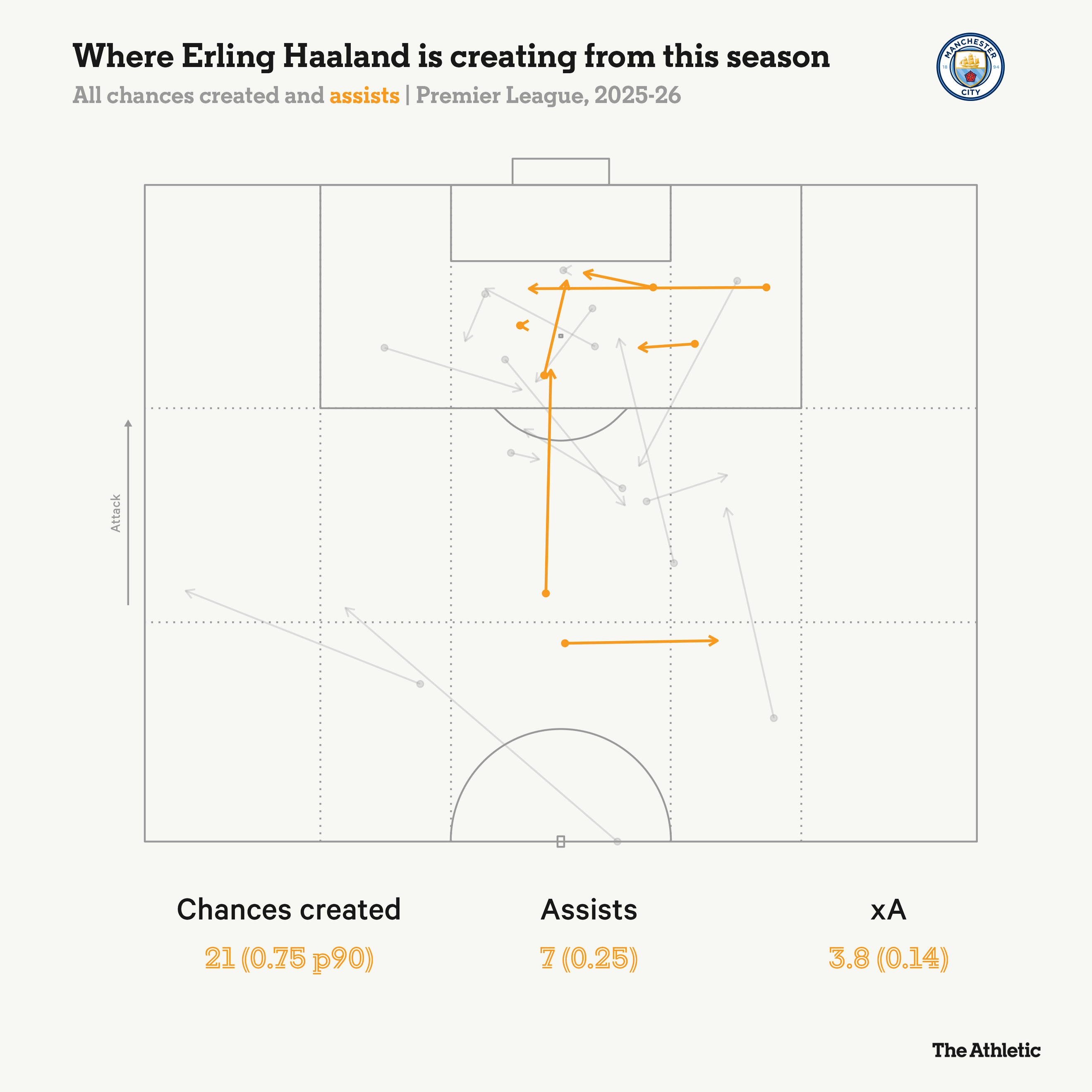 Haaland’s role has broadened with the shift. He has seven assists, one short of his best domestic league return (eight in 2022-23), and he trails only Cherki for open-play assists in the Premier League. His combined output of 29 goals and assists leads the league, four clear of Fernandes.