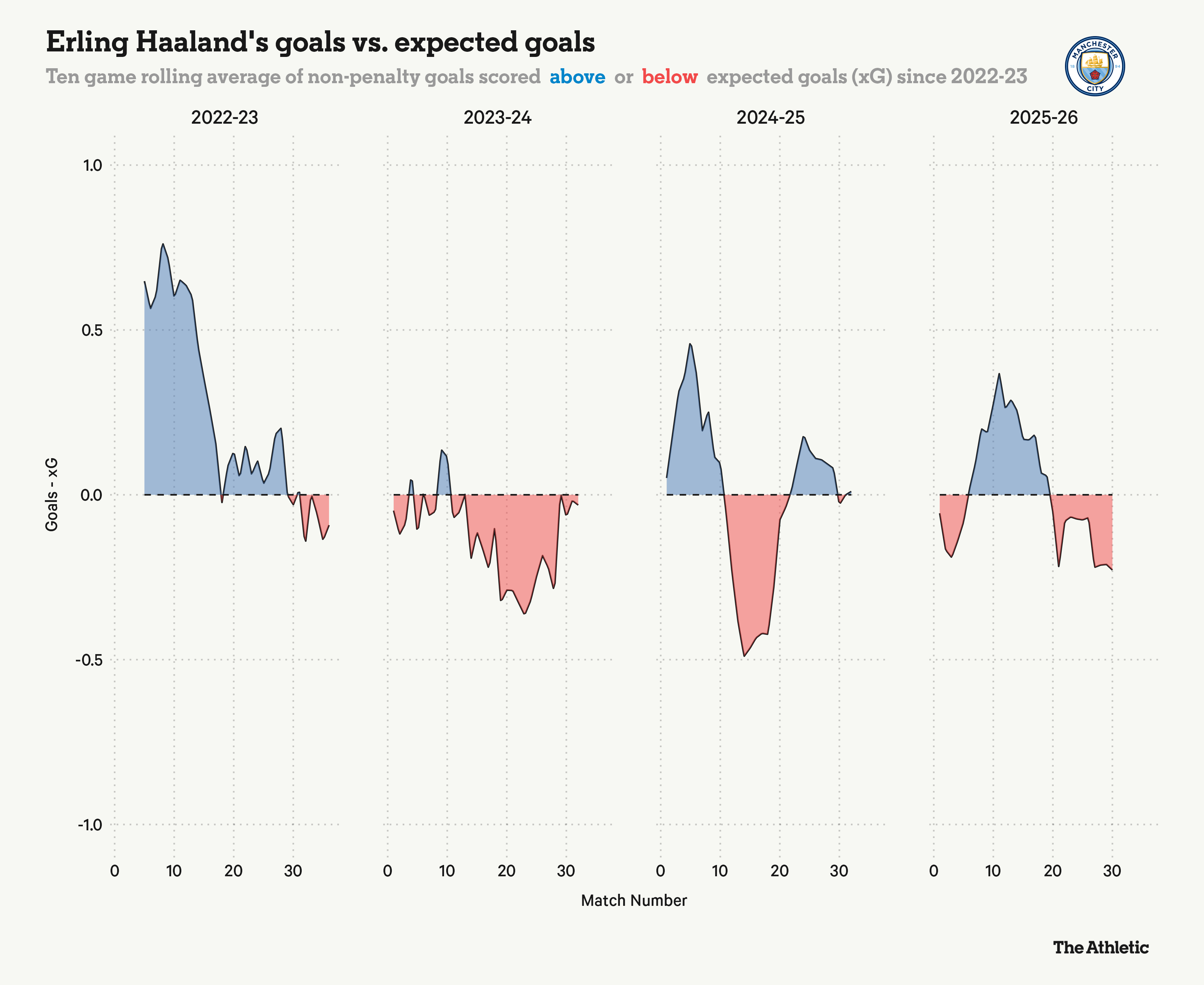 Then the rhythm changed. Since the turn of the year, Haaland’s goals have slowed to a trickle: three in 2026, only one from open play.