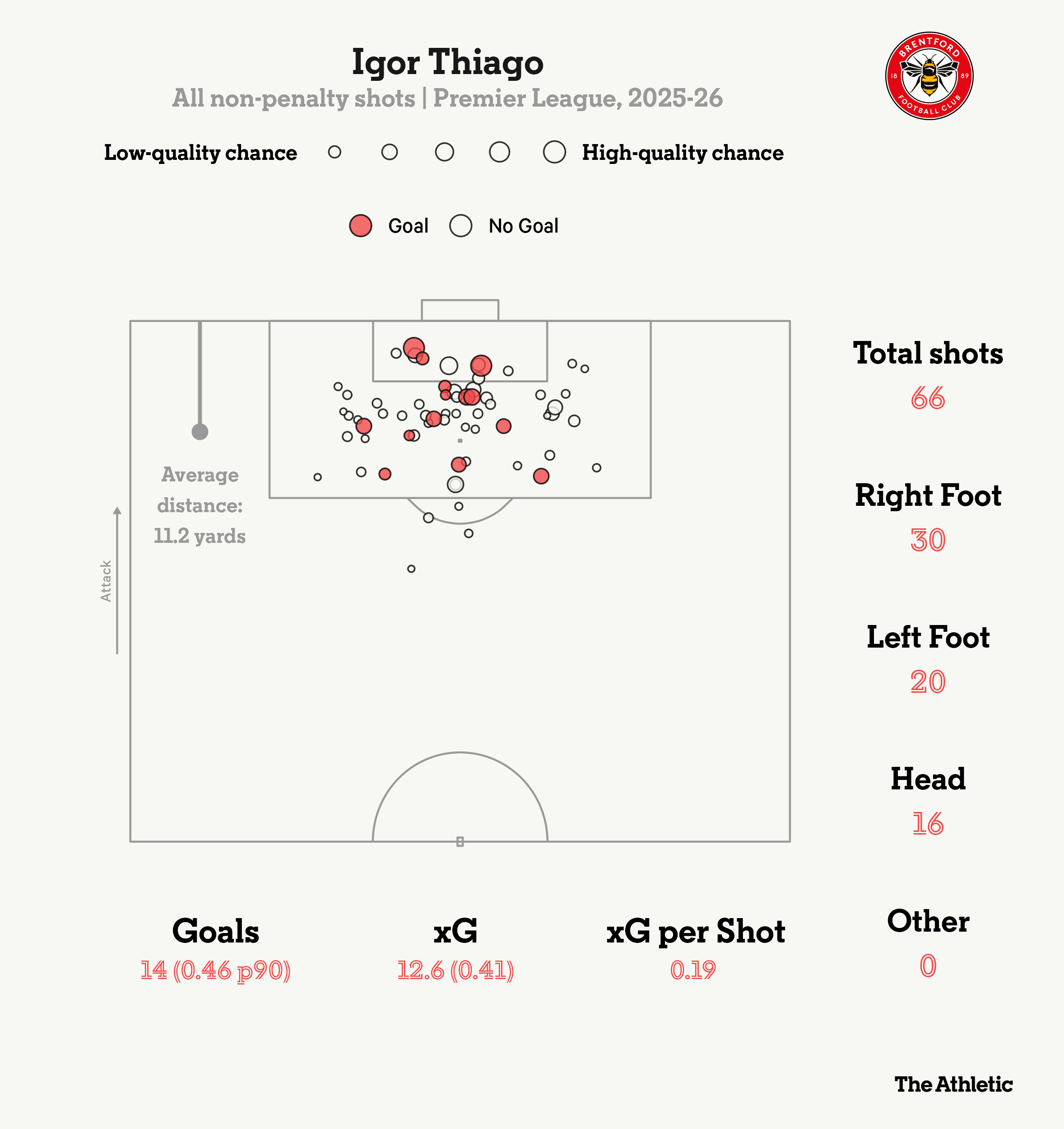 Thiago is the clearest expression of that approach. Among players with eight or more Premier League goals this season, no one has a higher xG per shot (0.26) or a better conversion rate (28.4 per cent). All 21 of his goals have come from inside the box. Like Brentford, he does not hunt speculative efforts; he is a modern penalty-box predator, reliant on timing and on occupying the highest-probability zones in the area.