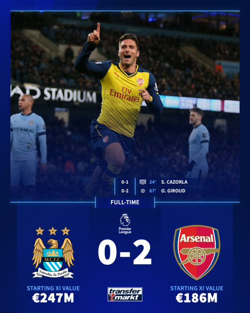 Ahead of him was Cazorla (€26m) and Aaron Ramsey (€24m). Chilean star Alexis Sánchez (€38m), the most valuable Arsenal player that day, started on the left-wing. Meanwhile, Englishman Alex Oxlade-Chamberlain (€17m) was on the right flank. Leading the line was Frenchman Giroud (€20m). The entire Arsenal XI boasted a market value of €186m.