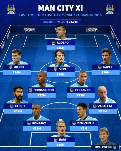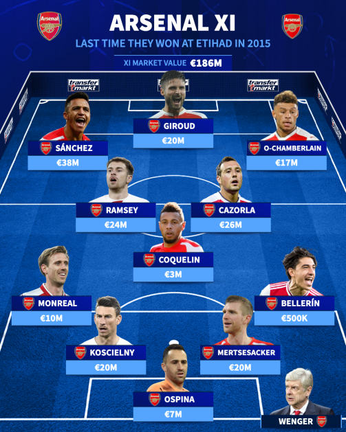 Both 2015 XIs revealed 11 years on from last Arsenal win at the Etihad