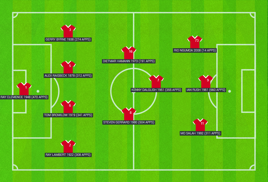 If you put Billy Liddell (1922 with 228 goals in 534 apps) on the LW instead of Rio, you can put Dom (2000) in the middle over Hamann. This would free up the 1970s, which means you could play Carragher (78) or Hyppia (73) instead.