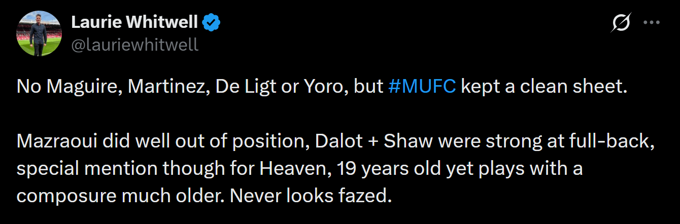 ![[Laurie Whitwell] No Maguire, Martinez, De Ligt or Yoro, but #MUFC kept a clean sheet.