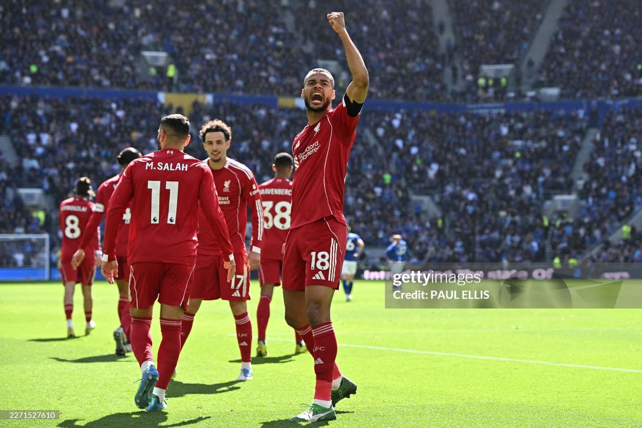 Liverpool’s Dutch striker #18 Cody Gakpo (C) celebrates Salah’s opening goal during the English Premier League football match between Everton and Liverpool at Hill Dickinson Stadium in Liverpool, north west England on April 19, 2026. (Photo by Paul ELLIS / AFP via Getty Images) / RESTRICTED TO EDITORIAL USE. No use with unauthorized audio, video, data, fixture lists, club/league logos or ‘live’ services. Online in-match use limited to 120 images. An additional 40 images may be used in extra time. No video emulation. Social media in-match use limited to 120 images. An additional 40 images may be used in extra time. No use in betting publications, games or single club/league/player publications. /