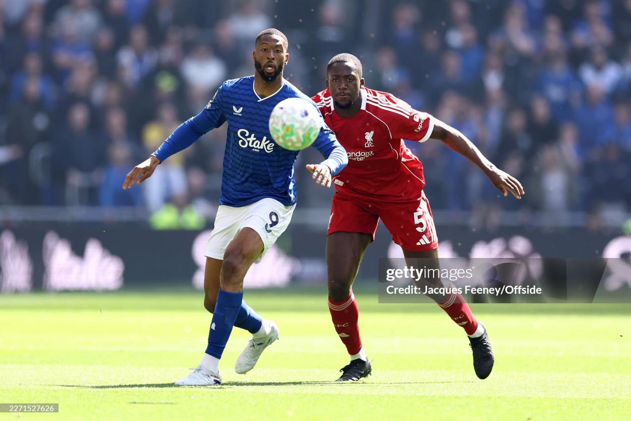 LIVERPOOL, ENGLAND – APRIL 19: Beto of Everton and Ibrahima Konate of Liverpool during the Premier League match between Everton and Liverpool at Hill Dickinson Stadium on April 19, 2026 in Liverpool, United Kingdom. (Photo by Jacques Feeney/Offside/Offside via Getty Images)