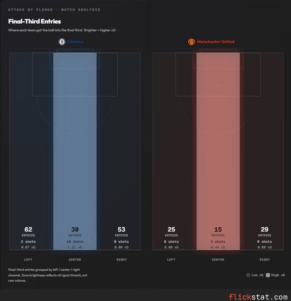 115 entries down the flanks produced 2 shots. Basically all of Chelsea's threat came through the middle, and even then — without proper support structure around Delap — most of those shots were from around the edge of the box rather than from inside the six-yard area where you actually convert.
