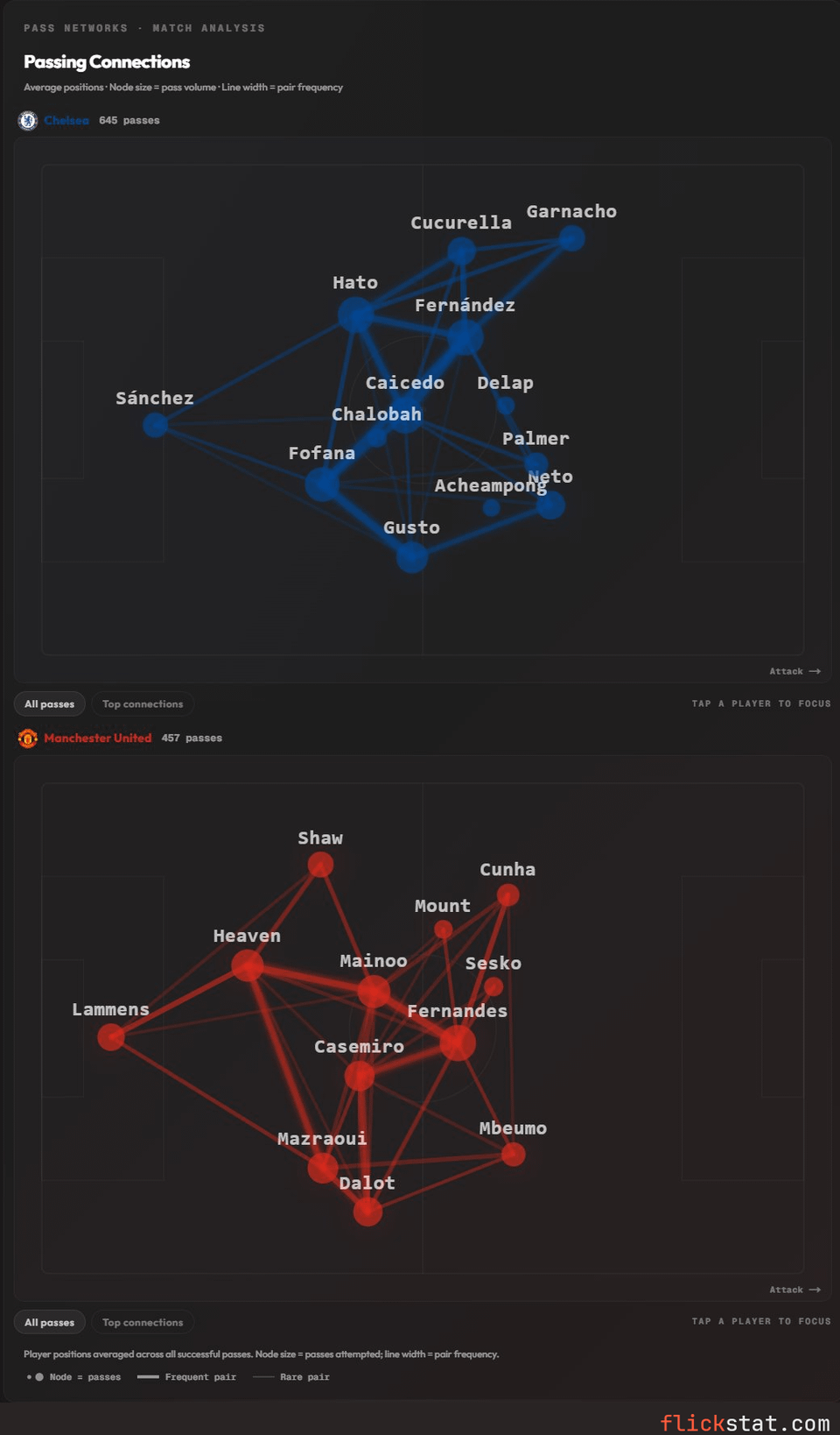 Start with Delap. Small node, isolated up top, thin lines to everyone around him. He played the full 90 as Chelsea's lone striker and you can see what that actually looked like — a target man who rarely got the ball and had to make something out of the few moments he did touch it. The header off the woodwork was one of those rare moments. Most of the match, the supply just didn't reach him.