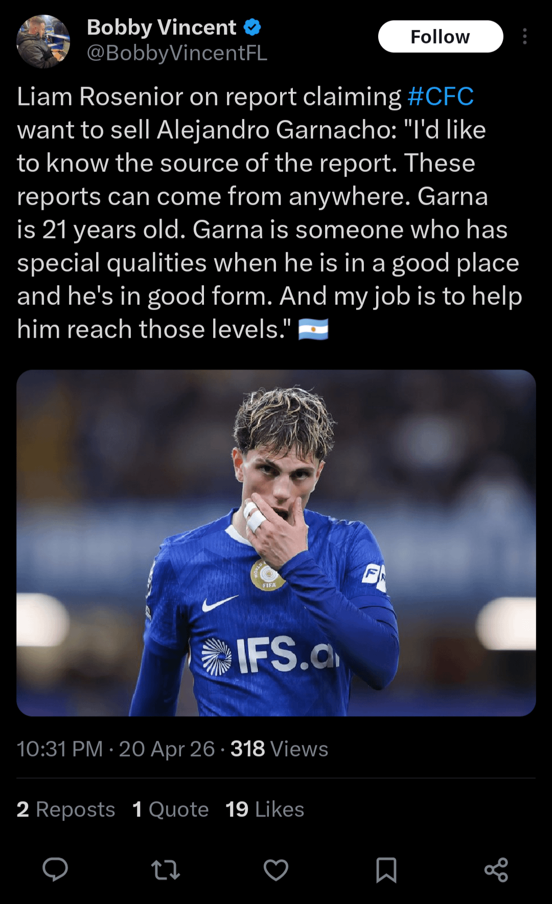 [Bobby Vincent] Liam Rosenior on report claiming #CFC want to sell Alejandro Garnacho: “I’d like to know the source of the report. These reports can come from anywhere. Garna is 21 years old. Garna is someone who has special qualities when he is in a good place and he’s in good form.”