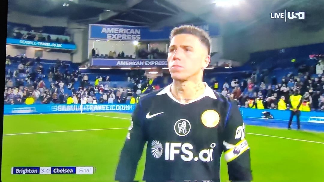 Enzo is the last Chelsea player off the pitch after a disappointing performance. Enzo is just staring at the away end whilst doing up his captains arm band.
