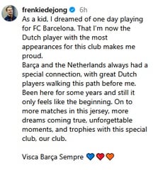 Frenkie de Jong on Instagram: “As a kid, I dreamed of one day playing for FC Barcelona. That I’m now the Dutch player with the most appearances for this club makes me proud. Been here for some years and still it only feels like the beginning. Visca Barça Sempre”