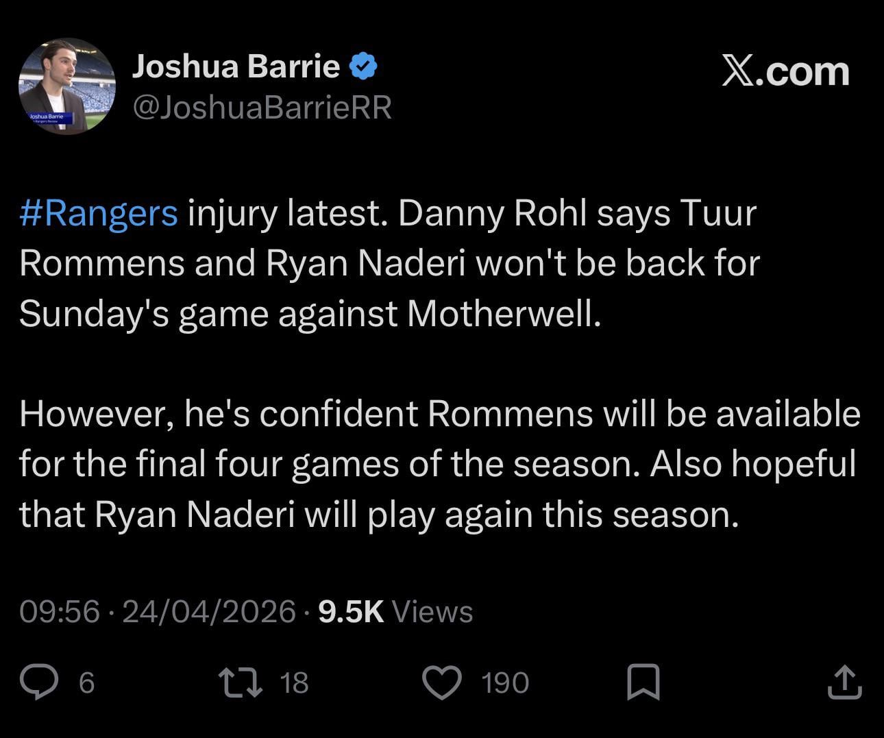 ImpactAffectionate86 on April 24, 2026 10:02 am Happy with that. I’d be more worried about Rommens getting injured if he did play on Sunday, than I am with him missing out completely.