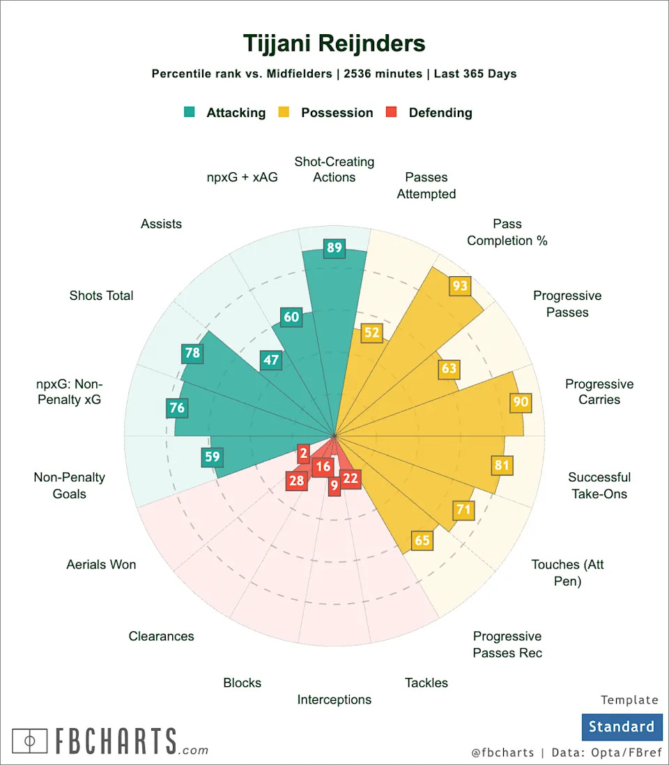 Numbers often tell the story more bluntly than narrative, and Reijnders’ regression is clear. Compared with his final campaign at Milan, his output has halved across key metrics.