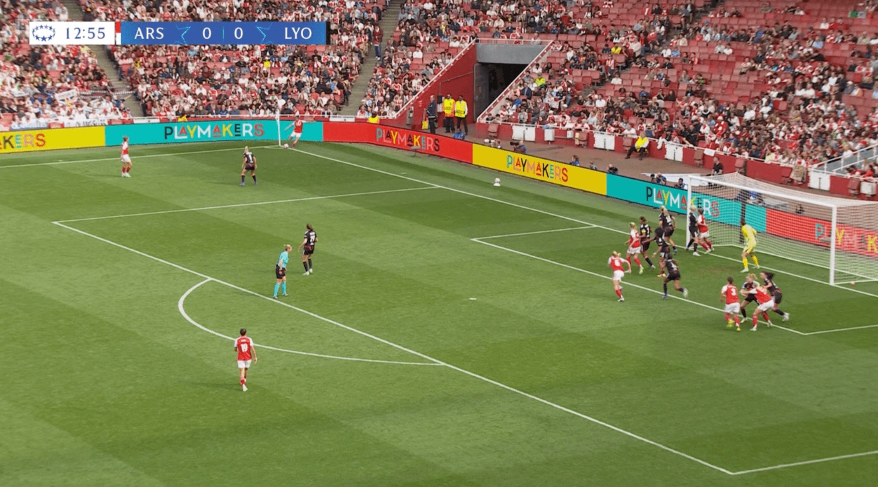 Although a freak incident, it was actually very similar to a corner Arsenal played in the first half. In that moment, Caldentey looked up, assessed the situation, and raised her right arm. Then, rather than whipping the ball into the middle, she sidefooted it along the ground. Leah Williamson, making a run around the pack of players from the far post to the near, couldn’t reach the ball, and it was cleared. An irrelevant incident in isolation.