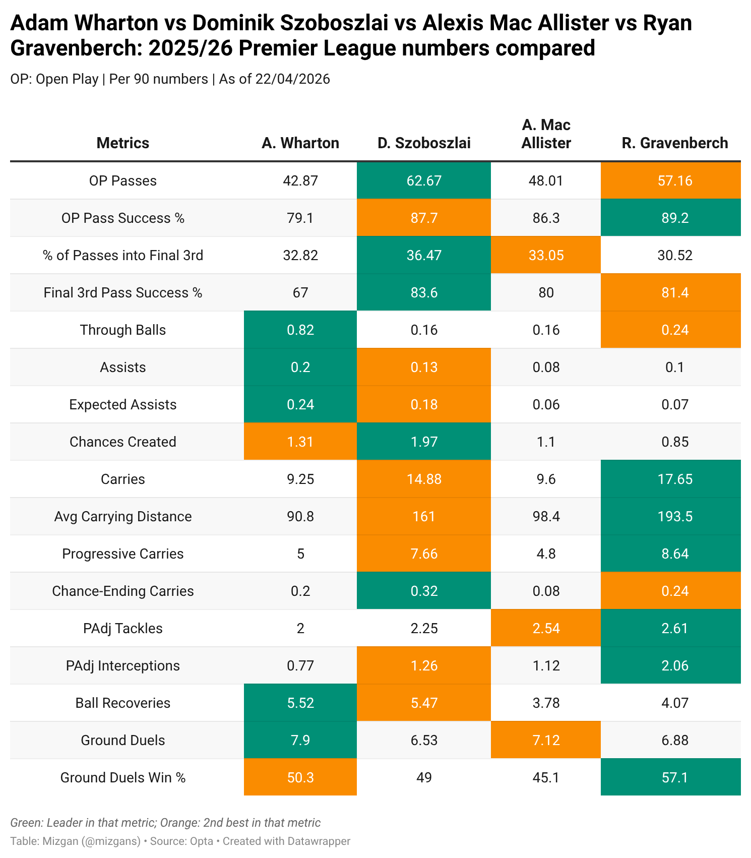 In terms of carries and their effectiveness, it is no surprise to see Gravenberch posting strong numbers in that area. Even in possession-adjusted tackles and interceptions, the Dutchman is ahead of the rest. In overall ball recoveries, Wharton edges the Liverpool midfield contingent, while in ground duel win rate, he is close to Szoboszlai and some way behind Gravenberch.