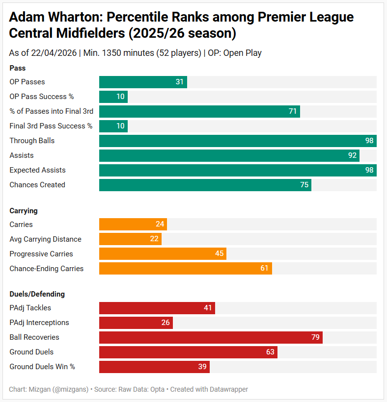 With less than an 80% overall pass success rate from open play (in raw numbers), it is no surprise that Wharton ranks among the lowest midfielders in that metric. However, the caveat is his higher ranking in through-ball attempts, chances created, expected assists, and the proportion of passes into the final third.