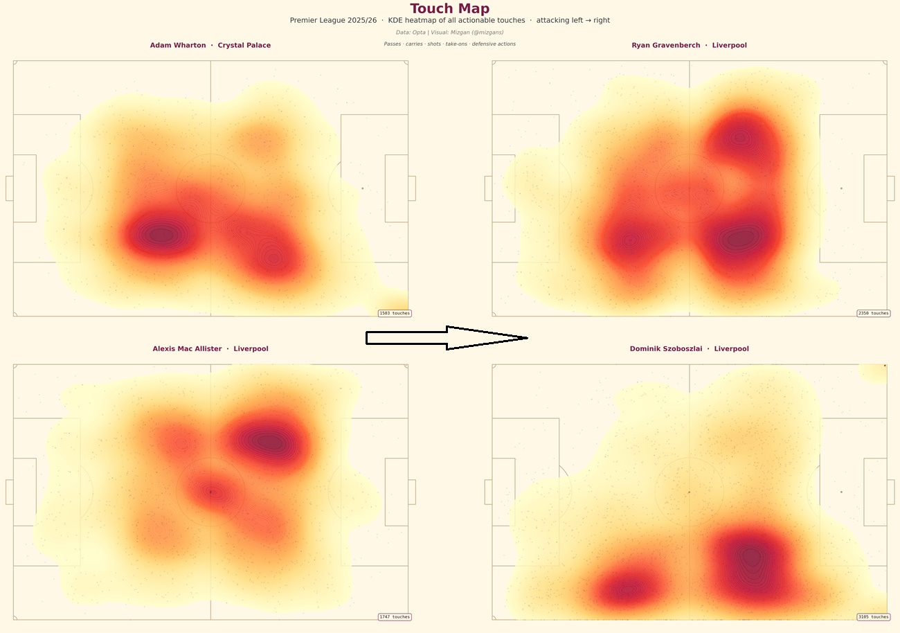 Next up, we have a four-way plot comparison looking at Wharton, Szoboszlai, Mac Allister, and Gravenberch, with their actions plotted on a football pitch across key metrics, including passing, threat generation from passes, ball reception zones, and ground duels.