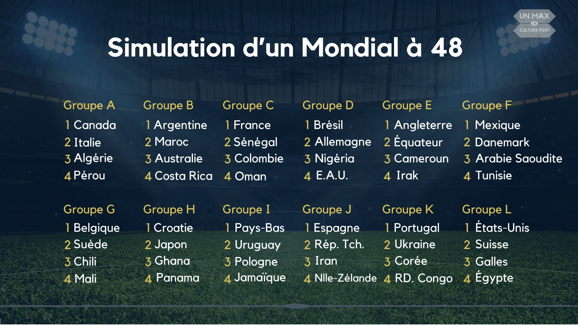 [Un Max de Foot](https://www.youtube.com/@unMAXdeFOOT), a French Youtuber, made a video about the World Cup with 48 teams. To prove it’s not a bad idea after all, he made a fictional draw adding 12 teams based on their results during the 2022 WC qualifiers. It’s not perfect but it seems good. I don’t like the idea to put Italy instead of North Macedonia because the latter beat Italy to reach the final stage of UEFA qualifiers against Portugal.