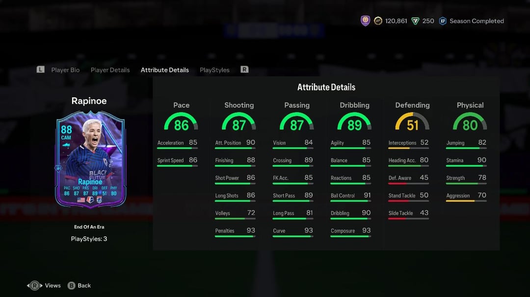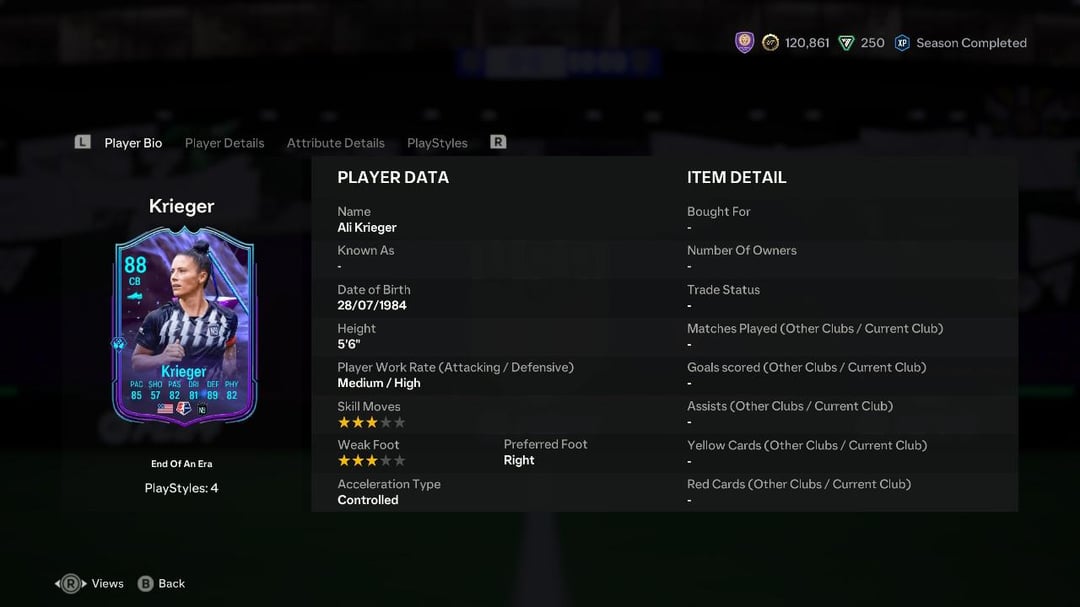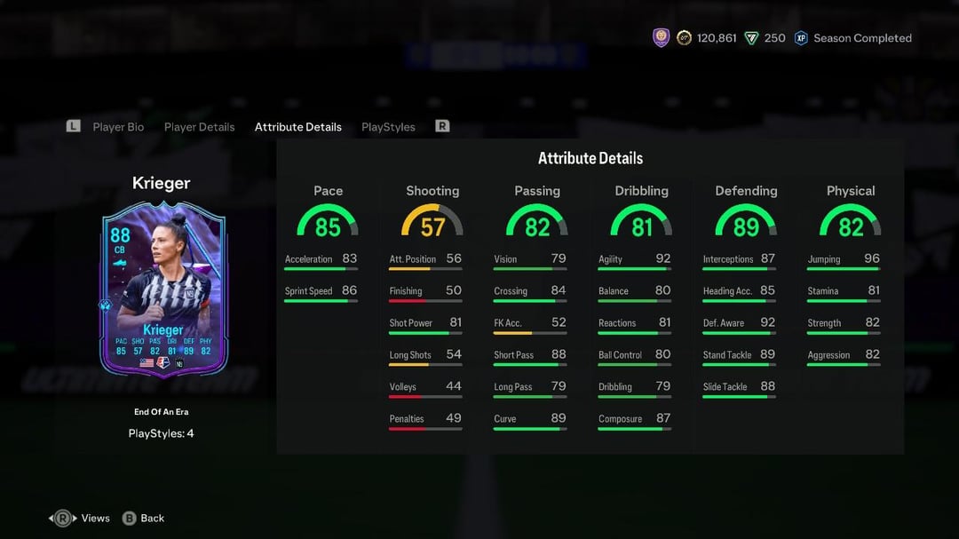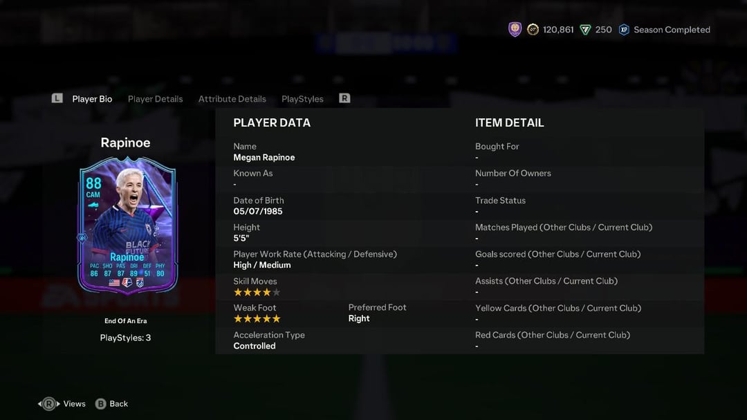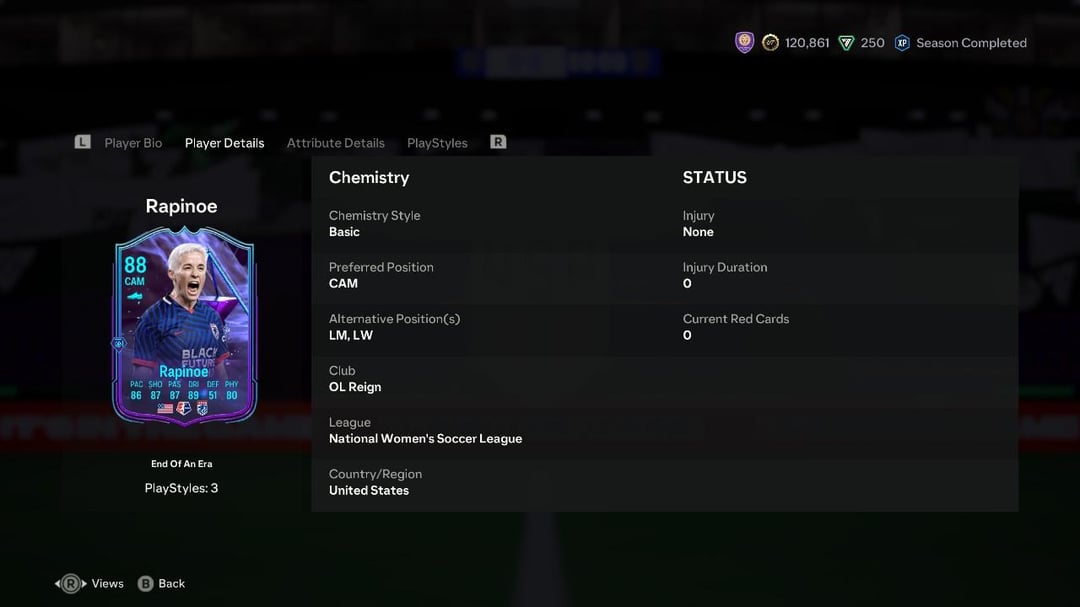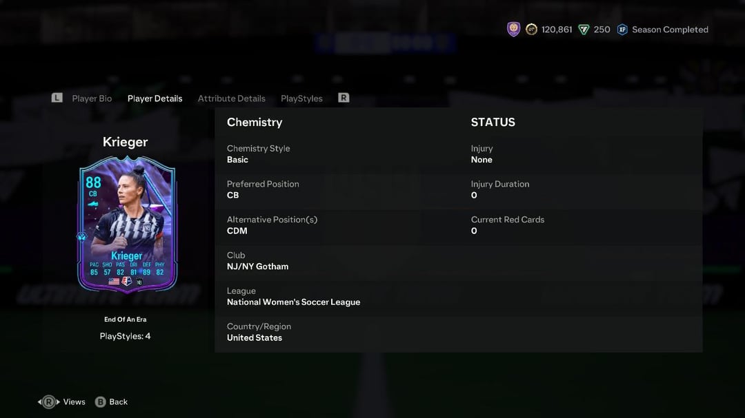 Following the NWSL Championship, EA Sports has recognized both Megan Rapinoe’s and Ali Krieger’s careers with an 88 OVR End of an Era Ultimate Team card for each available in Squad Building Challenges (SBCs) until mid-December