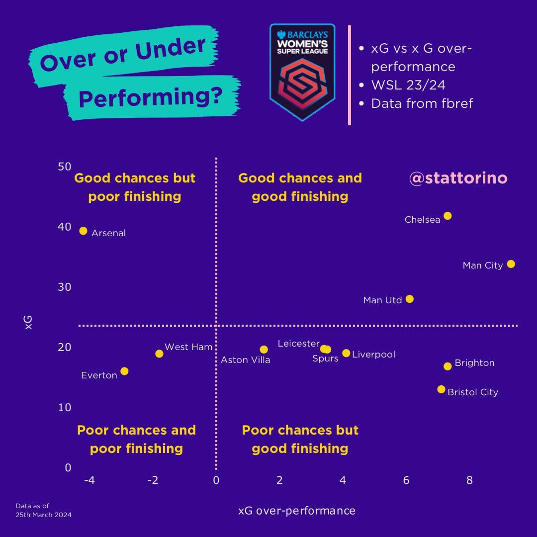 [Stattorino] Comparing the xG a team accumulates to how much they over-perform ๐Ÿ”ข๐Ÿ“Š Chelsea, City and Utd lead the way, over-performing on high xGs ๐Ÿ‘ Arsenalโ€™s poor finishing is costing them a lot of goals ๐Ÿ˜ณ Bristol City & Brighton have very good finishing ๐Ÿ”ฅ