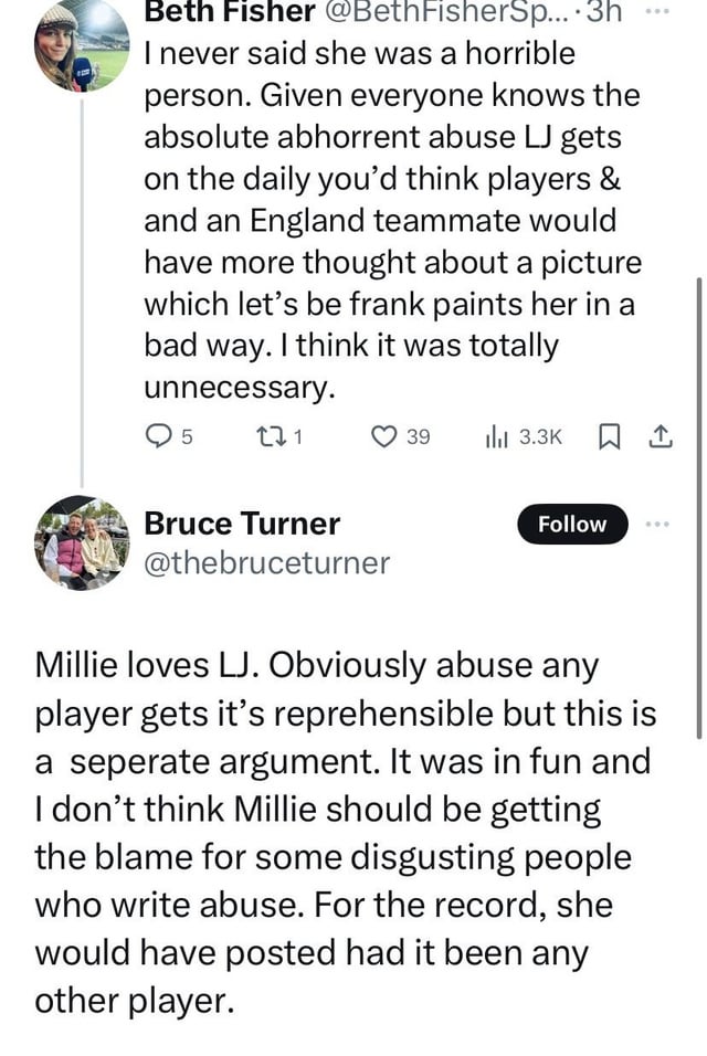 Here’s what he, and other people saying similar things, are ignoring. In a perfect world, yes, a player can have a little social media banter about anyone. But this world is not perfect at all. Public figures such as Turner are in charge of their own media presence, but also have some obligation to understanding how other people will react, and how their social media presence either can and will fan the fire on things or calm things down. If Turner didn’t initially realize how her post would be fuel for racists and for hate, okay. But she could have and should have never reposted it and deleted it after it *was* used for that. The missteps are that she’s not responsibly understanding her position as someone who can either defend or make things worse for Lauren James.